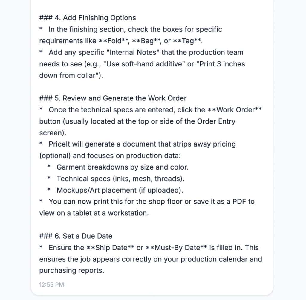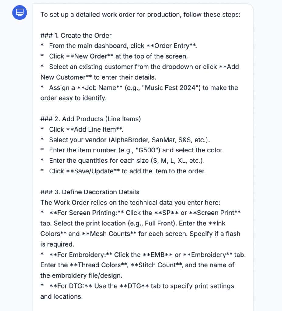 Behind the scenes, the AI cleans and organizes the material. It groups content by real-world tasks like order entry, accounting connections, shipping, production scheduling, and reporting. I also taught the AI how to communicate clearly and practically. Step by step. It knows how to say when an answer doesn’t exist in its database. Because it understands industry-specific language, it handles stitch counts, screen setups, garment ordering, and artwork approvals without confusion.